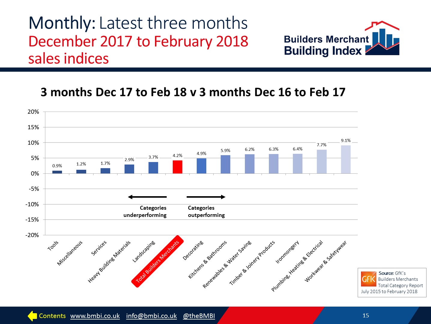 Five categories showed an improvement: Plumbing Heating & Electrical (+7.9%), Timber & Joinery Products (+6.6%), Ironmongery (+5.0%), Kitchens & Bathrooms (+4.6%) and Workwear & Safetywear (+4.5%).