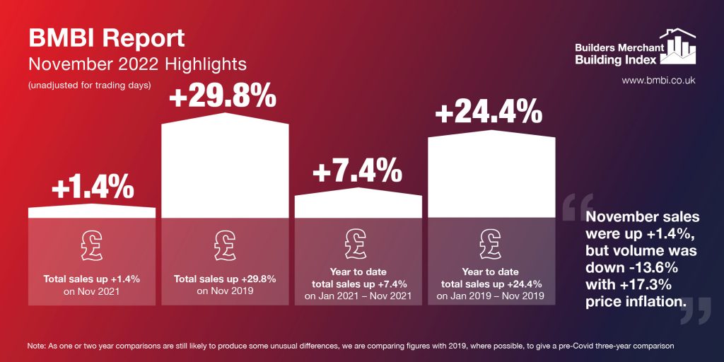 The latest figures from the Builders Merchant Building Index (BMBI), published in January, reveal that builders’ merchants’ value sales were up +1.4% in November 2022 compared to the same month in 2021. This was inflation-led growth as volume sales tumbled -13.6% while prices climbed +17.3%.
