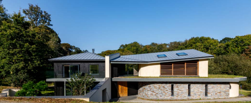 Further through the property, the entrance wing accommodates three sizable bedrooms and a playroom for the clients two young children. All rooms benefit from views of the woods to the east and private amenity area (garden). This was designed with a contemporary Cornish appearance incorporating an interesting mono pitched zinc roof with wildflower green roof and natural stone walls.
