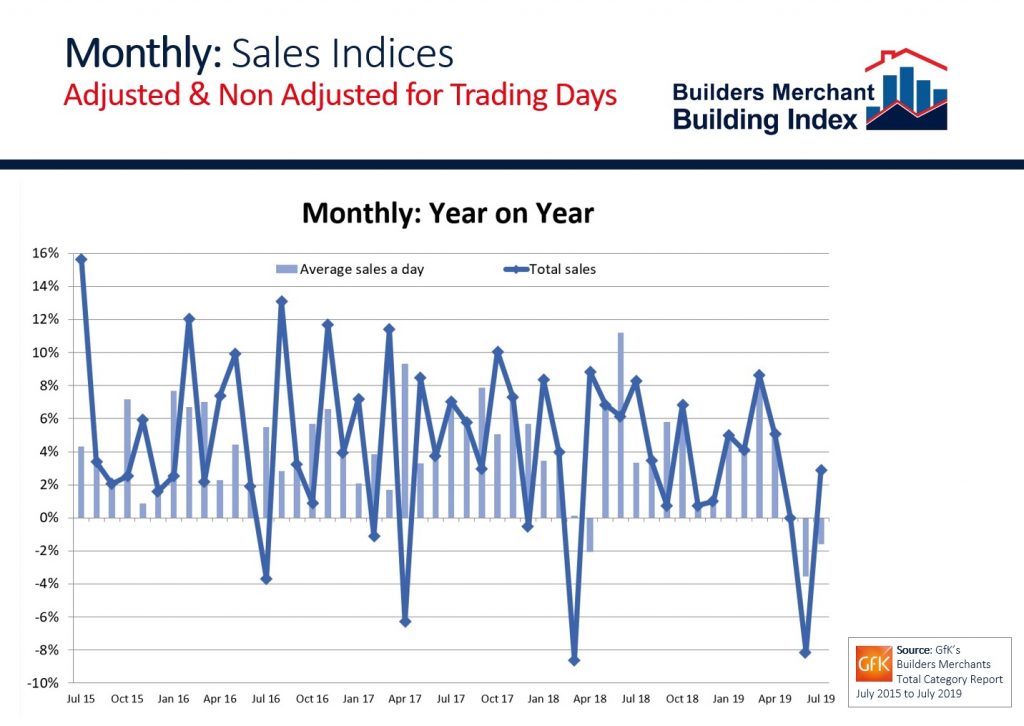 Total Builders Merchants value sales to builders and contractors in July were up 2.9% compared with the same month last year, according to BMBI stats.